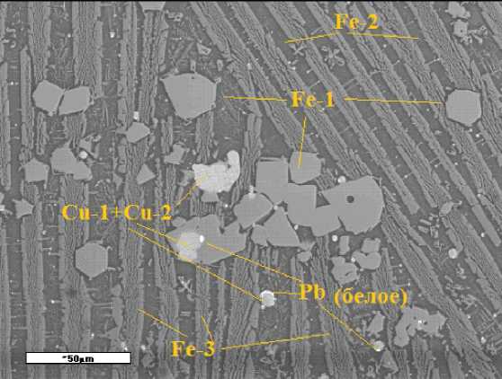 Рис. 4. Вкрапления магнетита, борнита и халькозина в шлаке с призматическими кристаллами фаялита. Фотография в обратно-отраженных электронах под микрозондом. Cu-1 – халькозин; Cu-2 – борнит; Cu-3 – самородная медь; Pb – свинец самородный