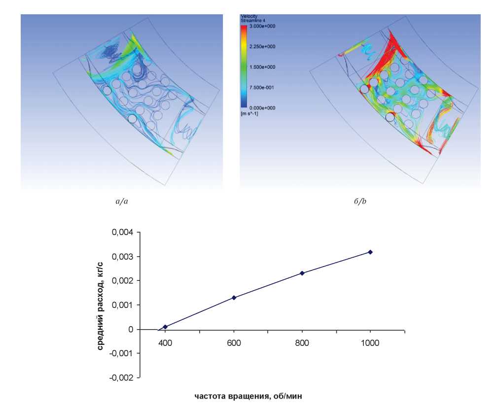 Согласно результатам компьютерного моделирования, повышение частоты вращения инструмента способствует проникновению части промывочной жидкости из торцевого канала в зону второго и последующих рядов режущих элементов бурового инструмента (рис. 3). При этом, согласно выражению (2), при вращении инструмента под его рабочим сектором возникает не только фрикционный поток, но и в силу перераспределения гидравлического давления за счет перемещения сектора формируется напорное течение. В то же время, проникая под сектор, жидкость теряет энергию за счет обтекания резцов, встречающихся на ее пути (рис. 3, а, б). Поэтому чем дальше от торцевого промывочного канала находится резец (считая от набегающей части сектора), тем меньше расход жидкости в его пределах (рис. 3, а, б).
