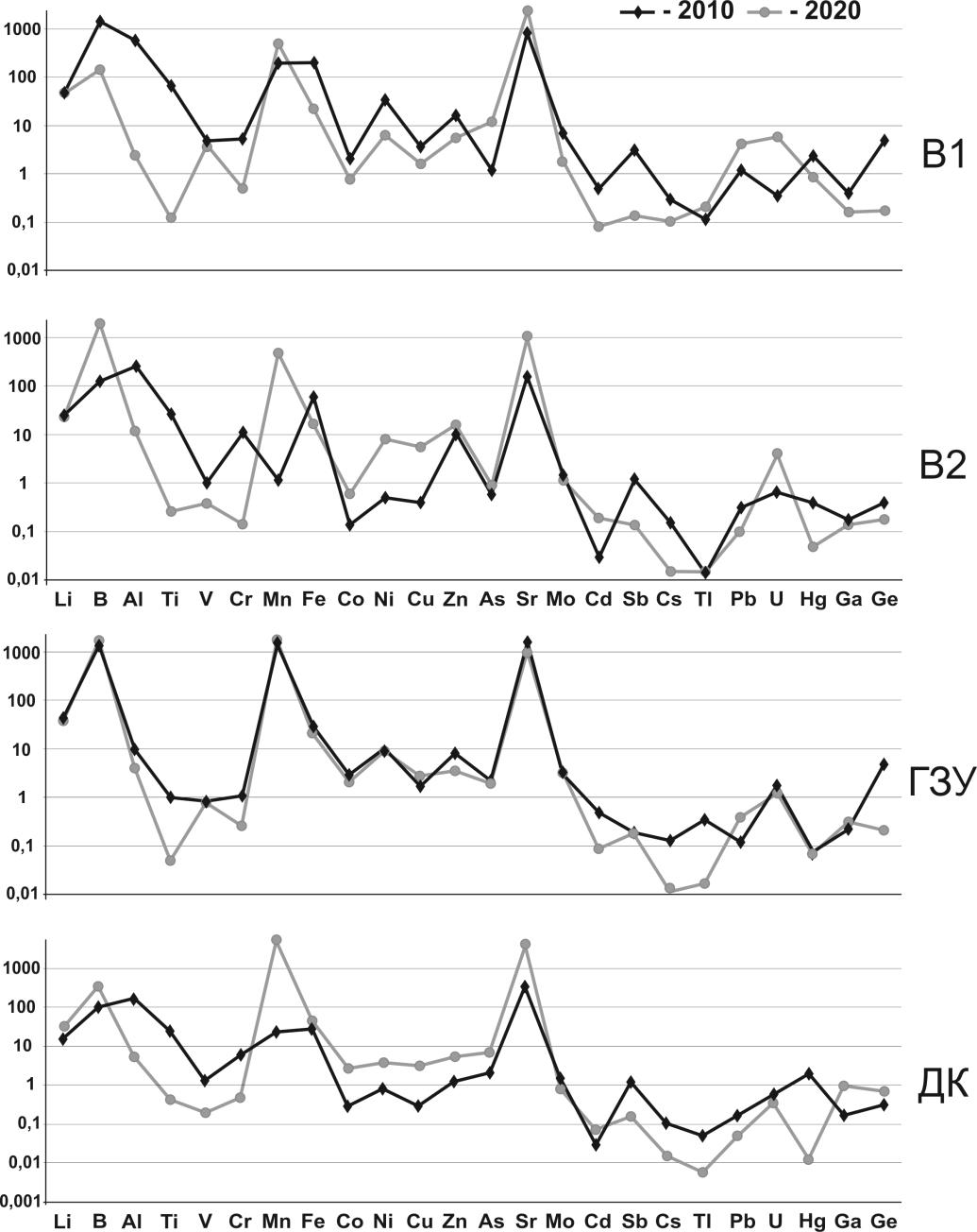 4. Fig. 3. Dynamics of trace elements concentrations in wastewater from effluent 1 (В1), effluent 2 (В2), ash removal ditch (ГЗУ) and drainage ditch (ДК) in 2010–2020, µg/l