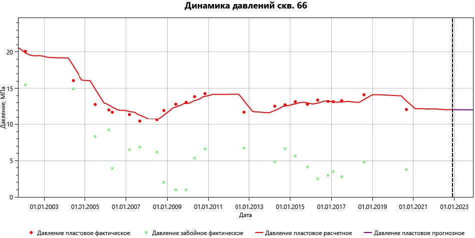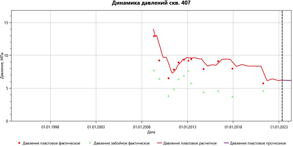 Определение величин пластового давления в модульном сервисе DSA, как отмечено ранее, основано на применении методов машинного обучения. Несомненными преимуществами реализованного метода являются высокая скорость вычислительных операций и минимальный набор исходных данных. Реализованный функционал позволяет выполнять ретроспективную (на весь период эксплуатации) и перспективную (на полгода) оценку величины пластового давления по каждой скважине с временным интервалом в один месяц. Результаты вычислений визуализируются в виде графиков (рис. 1), на которые также нанесены фактические величины пластового давления, определенные по ГДИ. Также результаты вычислений сводятся в таблицу, которая впоследствии используется в качестве исходных данных при графическом мониторинге разработки с построением карты изобар.