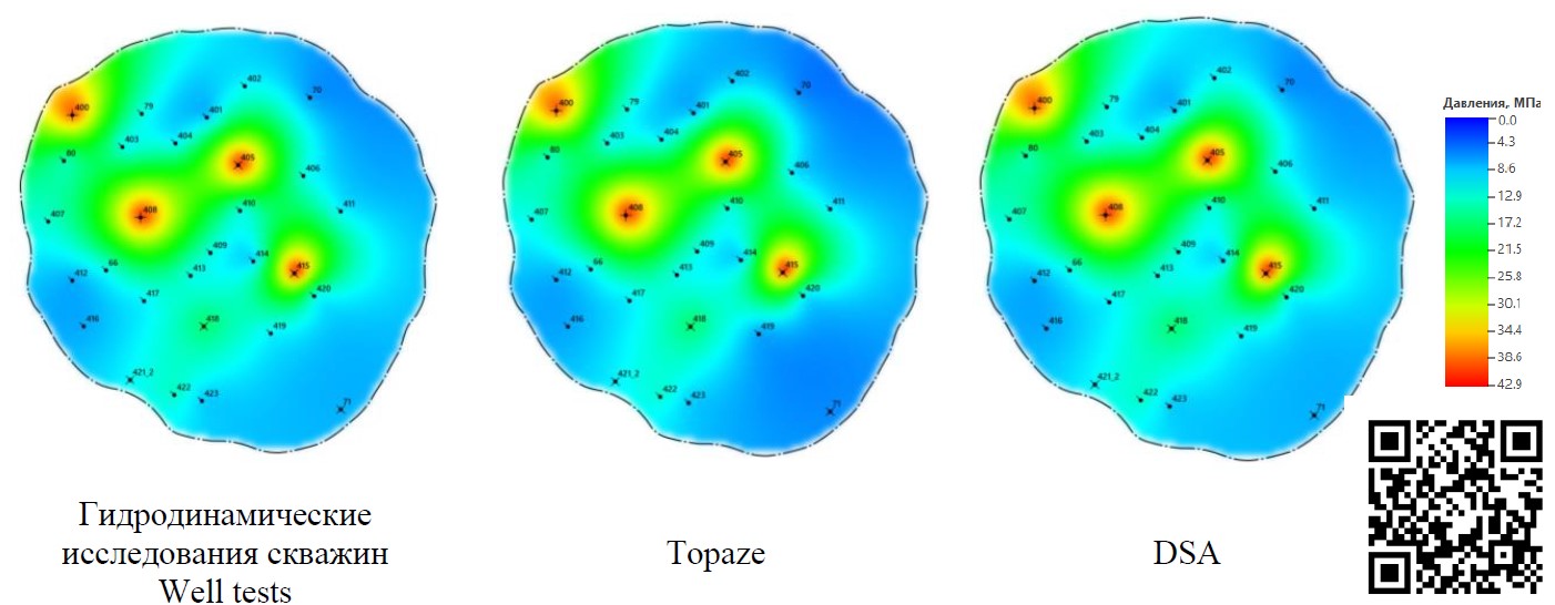 По результатам реализации косвенных методов определения пластового давления и их фактическим значениям построена карта изобар (рис. 3). Сервис автоматизированного построения карт изобар, как и других карт мониторинга разработки залежей (текущих отборов, накопленных отборов и др.) реализован в DSA (QR-код на сайт программы представлен на рис. 3), при этом дополнительно привлекаются координаты скважин и контуров нефтеносности, сведенные предприятием-недропользователем в единый файл.