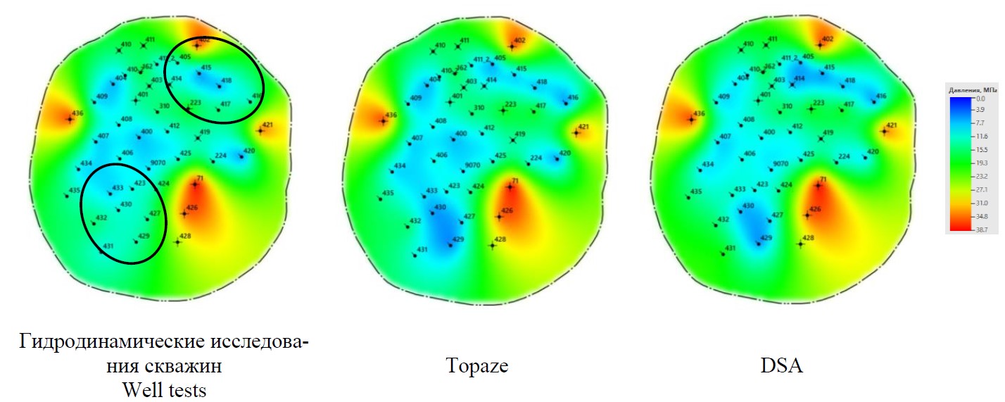 Аналогичные исследования выполнены также применительно к Гагаринскому месторождению. Карты изобар, построенные по фактическим (ГДИ) и косвенным (Topaze, DSA) определениям пластового давления, приведены на рис. 5. Карты также построены в специальном модуле автоматизированного сервиса DSA.