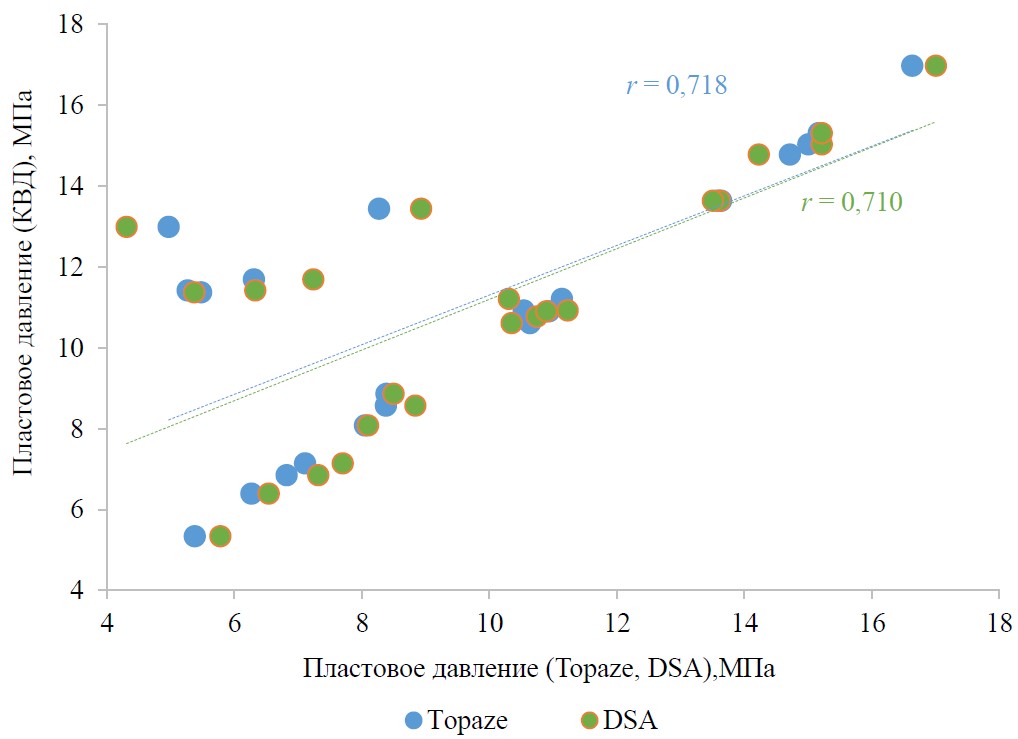 Определения пластового давления методами машинного обучения в сервисе DSA выполнены для каждого месторождения в автоматизированном режиме, суммарная продолжительность вычислительных операций не превысила пяти минут, по истечение которых получена ретро- и перспективная оценка пластового давления по каждой из скважин месторождения. Трудоемкость аналогичных вычислений в Topaze несоизмеримо больше, так же как и требования к компетентности специалистов.
