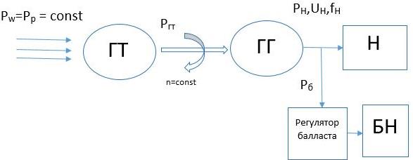 Принципиально, для создания управляющего тормозного момента гидрогенератора может использоваться отдельный балластный генератор. В этом случае гидроагрегат состоит из гидротурбины, вал которой приводит во вращение два управляемых гидрогенератора одинаковой мощности: основной для электропитания нагрузок микро-ГЭС, и балластный, нагруженный на балластные сопротивления, для регулирования суммарного тормозного момента гидроагрегата. Структурная схема такой микро-ГЭС приведена на рис. 3.