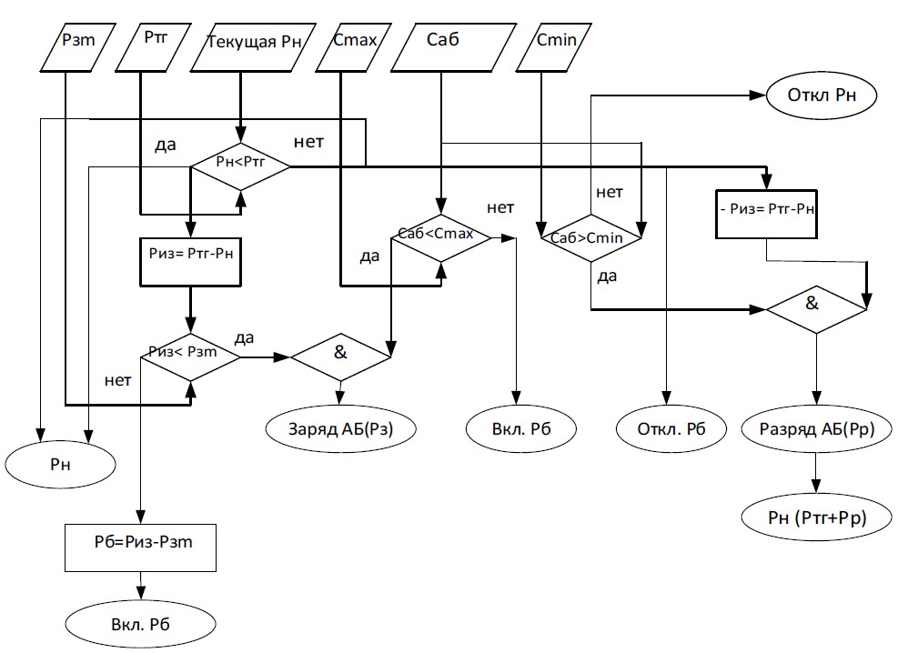 при условии Ргг=const, где PН, РГГ, PБ, РАБЗ, РАБР соответственно, мощность нагрузки, мощность гидрогенерации, мощность балласта, мощности заряда или разряда аккумуляторной батареи. Аккумуляторы должны запасать электроэнергию гидрогенератора в часы, когда гидрогенерация позволяет обеспечивать электропотребление нагрузки и заряд оптимальной мощностью аккумуляторов и отдавать её потребителю в часы пиковой нагрузки, дополняя номинальный уровень генерации до пиковой нагрузки [16].