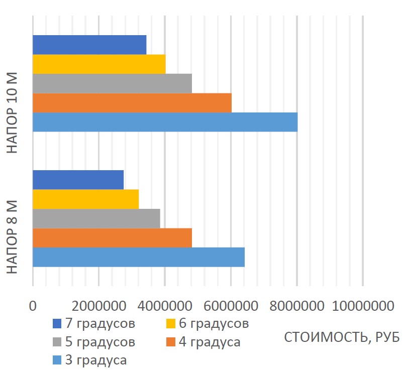 Стоимость стального напорного трубопровода для выбранной базовой микро-ГЭС при различных напорах с учётом гидравлических потерь и уклонов русла водотока показана на рис. 11.