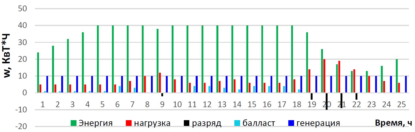Рис. 12. Диаграмма энергетического баланса автономной системы электроснабжения с инверторной микро-ГЭС, накопителем и балластом