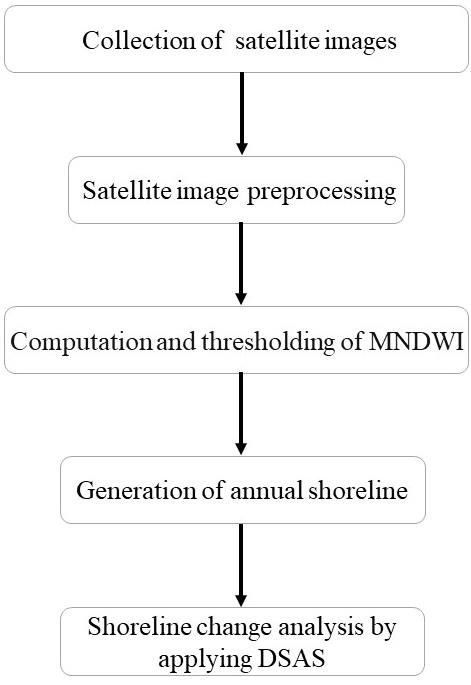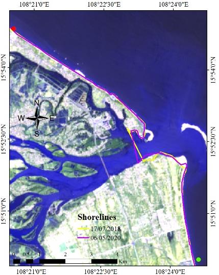 Coastal change monitoring technology is widely applied in the world, at present, there have been many studies using remote sensing data to classify land water from multi-time satellite images combined with geographic information system (GIS), and then superimposed to identify and evaluate shoreline changes. Specifically, the authors in used Landsat images combined with GIS to study shoreline changes in the Göksu estuary from 1984 to 2011 [4]. And the authors of extracted shorelines from multi-temporal (7 ETM+) satellite images combined with GIS to study the change of Marina coastline from 2009 to 2019 [5]. Abdoul et al studied and The research presents the Yanbu coastline change from 1965 to 2019 using Landsat and GIS satellite images [6].