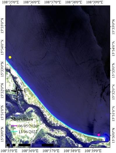 Besides, there have been a lot of studies on shoreline changes done in Vietnam in recent years. Specifically, Nhan et al. calculated the changing speed and trend of the Red River bank from Son Tay to Gia Lam area (Hanoi) using remote sensing images for the period 2007–2016 combined with GIS [7]. Tuan et al. used water indices such as NDWI, MNDWI, AWEI from Landsat 8 remote sensing images to determine water and land boundaries on the West coast of Vietnam [8]. Mau et al. used remote sensing images combined with shoreline survey by DGPS–Promark2, the results show that the erosion rate is higher than the deposition rate in Cua Dai area, mainly due to construction works and impacts of wave [9]. Cham et al. used remote sensing in combination with Delft3D and Mike 11 models to determine the cause and mode of erosion and deposition in Cua Dai area, showing that the process of erosion-deposition occurs in the Northeast winter with the cause of impacts wave motion of the northeast monsoon with wave height of approximately five meters with a frequency of more than 70% [10]. Quang et al. used the Digital Coastal Analysis System (DSAS) technique to statistically calculate the rate of change of the Quang Nam coastline from 1990 to 2019, showing that the Quang Nam coast was eroded and deposited over the past three decades and erosion is most severe in the north of Cua Dai, while shoreline evolution is recorded in the southern region [11]. In the authors used Telemac model combined with hydrodynamic and wave module to study Cua Dai area, showing the main trend of currents and waves towards the south, leading to erosion especially in the northeast monsoon season and deposited in the estuary [12].
