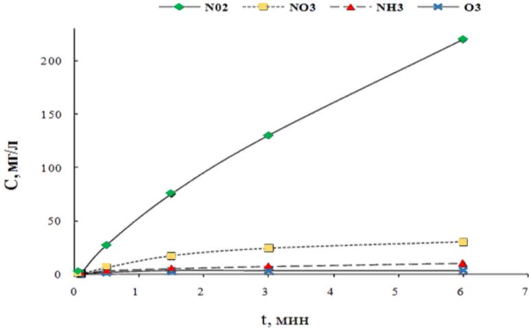 Исходя из результатов изучения концентрации конечных продуктов плазмохимических реакций в зоне СВЧ-разряда, представленных на рис. 1, преобладающее значение имеет синтез нитрит-ионов NO2–. Их концентрация на порядок превышает концентрацию образующихся нитрат-ионов NO3–. Следует отметить, что в результате диссоциации в зоне СВЧ-разряда молекулярного азота N2 (не более 1 %) происходит и синтез аммиака NH3, но ввиду того, что его концентрация чрезвычайно низкая, процесс носит побочный характер. Также в результате диссоциации в зоне СВЧ-разряда незначительного количества молекулярного кислорода О2 образуется озон О3, но его концентрация настолько мала, что присутствие озона в продуктах плазмохимических реакций носит следовой характер [26–29].
