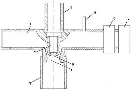 Рис. 2. Схема СВЧ-плазмотрона: 1 – прямоугольный волновод; 2 – внутренний проводник коаксиальной линии; 3 – внешний проводник коаксиальной линии; 4 – разрядная камера; 5 – трубопровод; 6 – сопло; 7 – магнетрон; 8 – циркулятор; 9 – патрубок