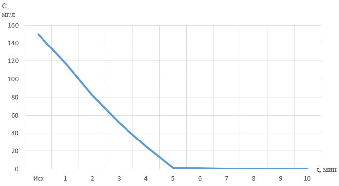 Исходя из результатов эксперимента, наиболее оптимальным явилось воздействие ионизированного газа на модельный раствор в течение 5 минут, в дальнейшем, при увеличении времени контакта раствора с нитрит-ионами, наблюдалось незначительное снижение концентрации ионов аммония. Эффективность удаления ионов аммония составила 99,83 %.