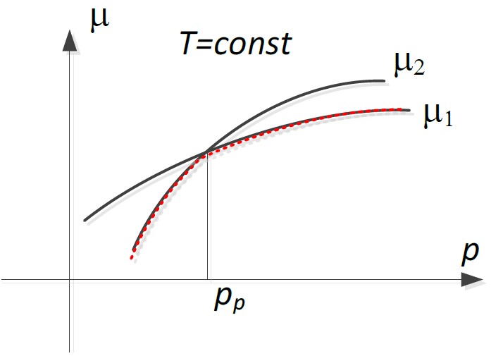 Рис. 4. Изотерма. Химический потенциал фаз при постоянной температуре. Наклон на графиках означает объем V= (∂μ/∂p)T. Объем изменяется скачком
