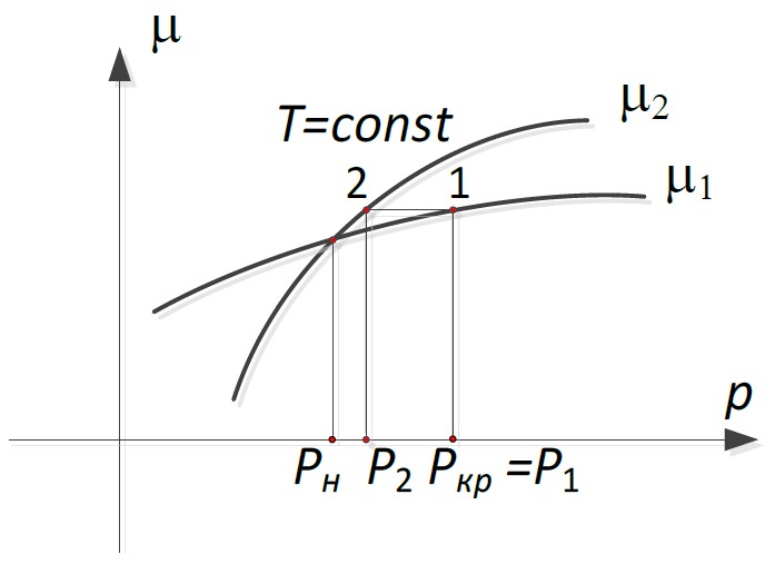 Когда две среды находятся в в термодинамическом равновесии, на границе раздела имеет место равенство химического потенциала μ1(T,Pн)=μ2(T,Pн), температуры T и давления Pн. Будем называть это давление Pн давлением насыщения (рис. 6). Для появления капли необходимо дополнительное давление, потому что капля выпуклая и, следовательно, в ней избыток давления, который компенсируется поверхностным натяжением среды.