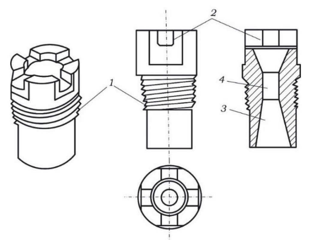 Рис. 4. Гидромониторная насадка для пород мягких и средней крепости: 1 – корпус с резьбой; 2 – паз под ключ; 3 – конус формирования напора струи; 4 – канал формирования напора струи