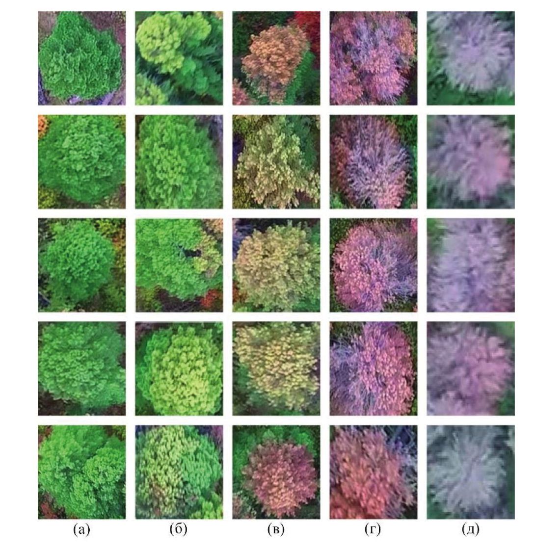 Шестым классом на снимках является «Фон» – деревья других пород и иные объекты земной поверхности. Отметим, что число состояний (классов) пораженных вредителями деревьев A. sibirica и P. sibirica различно, поскольку обе породы деревьев значительно отличаются по форме крон и физиологии. Это в совокупности со специфической специализацией двух вредителей P. proximus и I. amitinus приводит к различному протеканию в деревьях патофизиологических изменений, дающих разные характерные визуальные признаки крон деревьев. На рис. 2 представлены кроны деревьев кедра P. sibirica перечисленных классов.