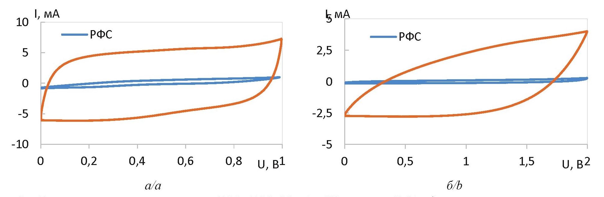 Гальваностатические кривые заряда-разряда получены при токах 1 мА/с и представлены на рис. 4, a, b для водного и органического электролитов. Можно отметить, что для кривых РФС+CO2 характерна практически треугольная форма кривой. Это подтверждает предположения о простой диффузии ионов электролита по порам образцов и высокой обратимости заряда электрода, обнаруженной по результатам циклической вольтамперометрии. Падение напряжения в водном электролите H2SO4, соответствующее величине последовательного сопротивления ячейки, составило 0,321 и 0,008 В для РФС и РФС+CO2 соответственно. Значения падения напряжения для этих же образцов в органическом электролите характеризуется величинами 0,368 и 0,138 В.