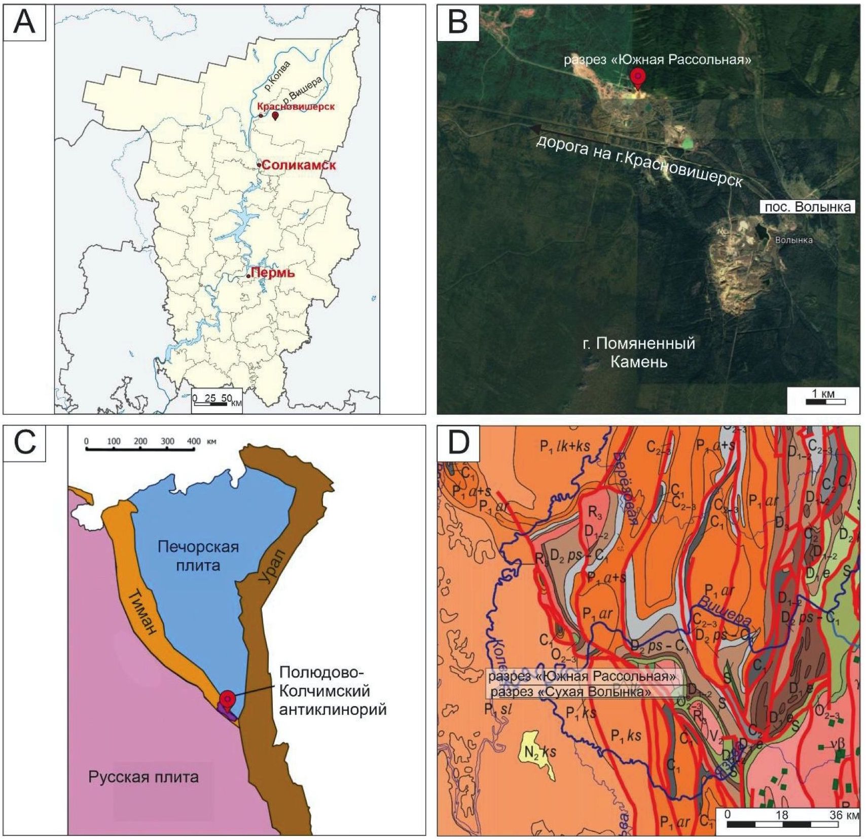 Рис. 1. Местоположение района исследований. Разрез «Южная Рассольная» на карте Пермского края (А); разрез «Южная Рассольная» на космоснимке (В); Полюдово-Колчимский антиклинорий в составе Тимано-Североуральского региона (С), разрез «Южная Рассольная» и «Сухая Волынка» на фрагменте геологической карты Пермского края (D), легенду смотри в [11]