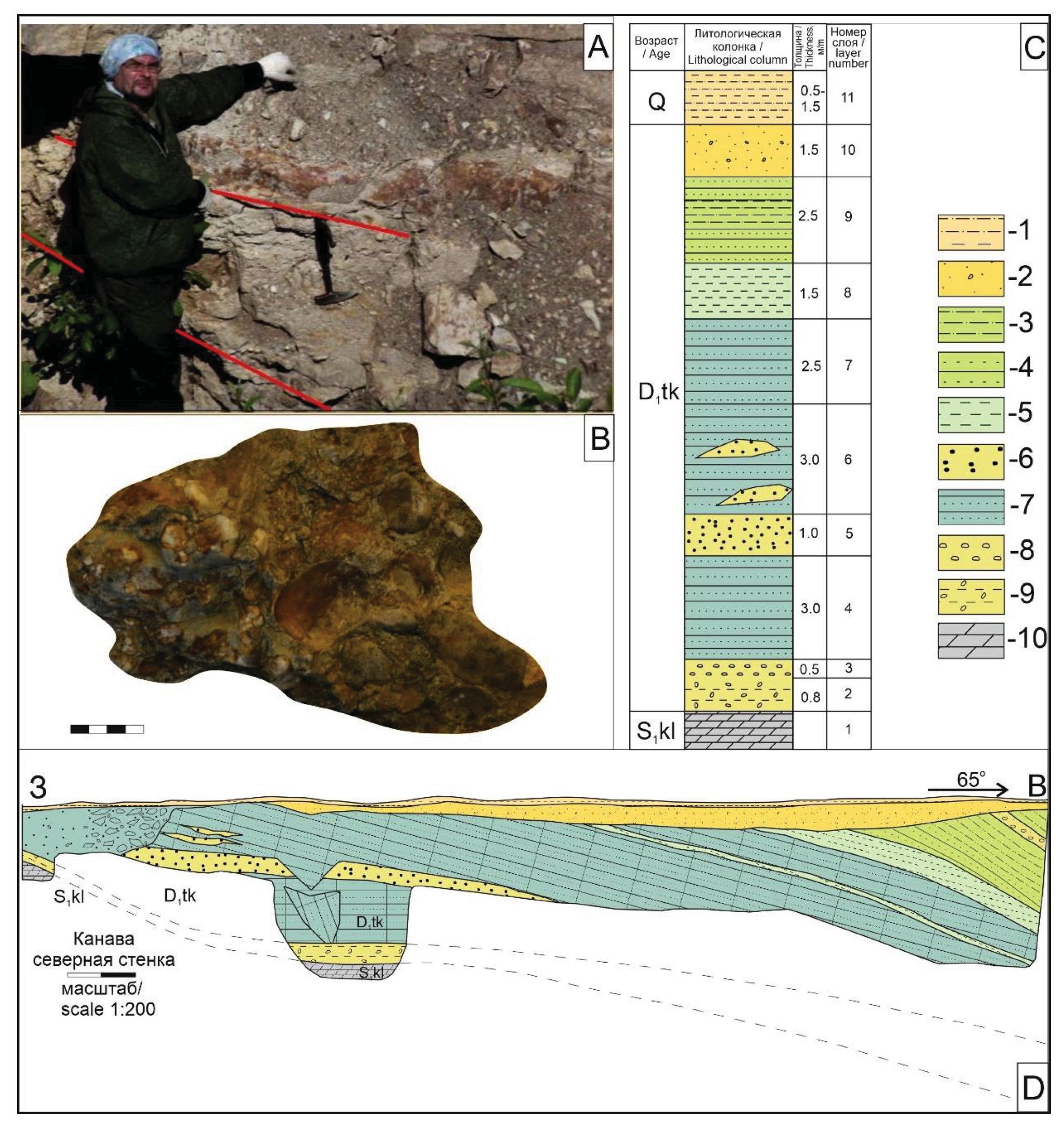 3. Рис. 2. Разрез «Сухая Волынка»: A – фото выхода горных пород на поверхность, базальные слои такатинской свиты; B – литифицированные конгломераты такатинской свиты, слой 3; C – литологическая колонка разреза; D – зарисовка разреза. Условные обозначения литологии: 1 – глина делювиальная с песком; 2 – песок с гравием и галькой; 3 – прослои зеленоватых алевролитов; 4 – песчаники зеленоватые; 5 – глина светло-зелёная; 6 – гравийный песок; 7 – песчаники светло-серые мелкозернистые; 8 – конгломераты, гравелиты, гравелито-песчаники светло-серые; 9 – дезинтегрированные конгломераты и гравелиты; 10 – доломиты светло-серые мелкокристаллические