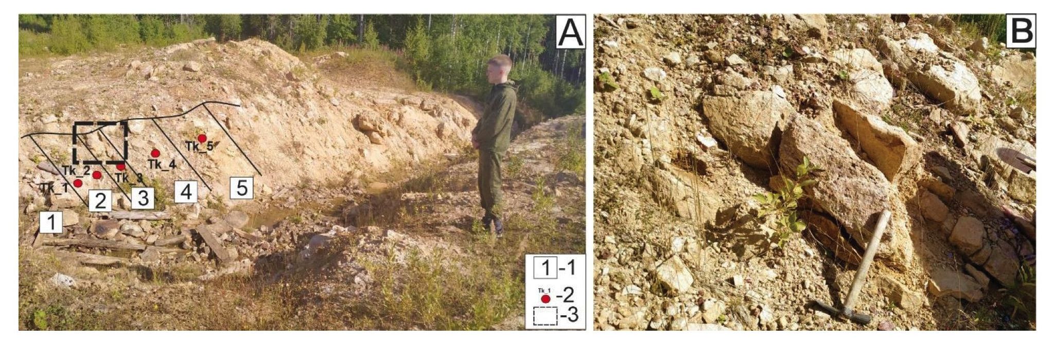 Рис. 3. Разрез «Южная Рассольная»: A, B – фото искусственного обнажения пород такатинской свиты. Условные обозначения: 1 – номер слоя; 2 – точка отбора пробы и ее номер; 3 – фрагмент обнажения (гравелиты такатинской свиты), увеличенный на рис. 2, В