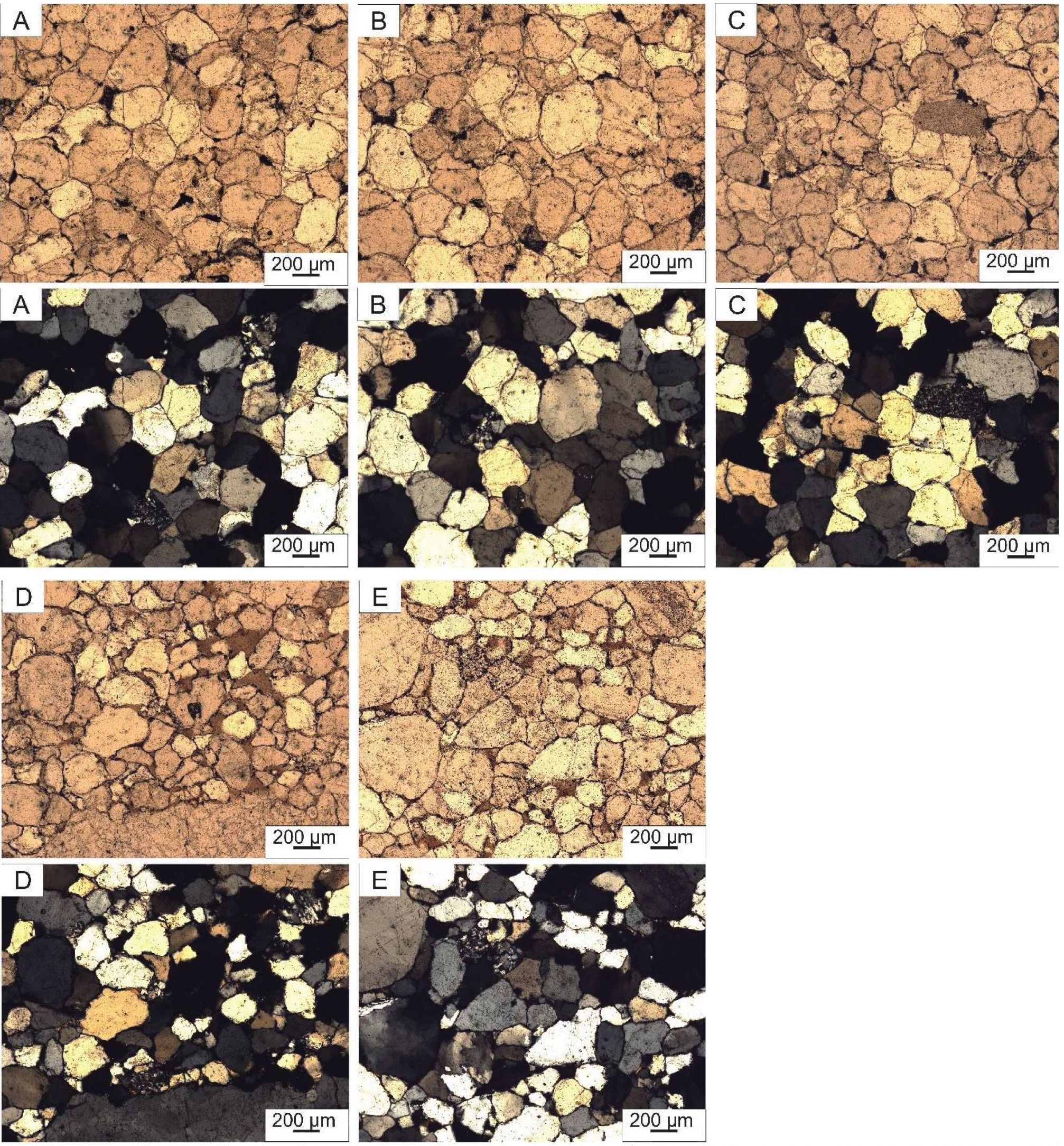 Fig. 5. Micrographs of thin sections of terrigenous rocks of the Takata formation: A – psammite structure with prevailing grain sizes of 0.2–0.26 mm, section fragment without analyzer; B – inequigranular sandstone with quartz grains and fragments of rocks of different degrees of roundness; С – quartz regeneration cement, section fragment without analyzer; D – cementless contact connection of quartz grains and rock fragments, which is characterized by a conformal structure; a single grain of zircon, a fragment of a thin section with an analyzer; E – film-pore clayey cement, predominantly hydromicaceous; fragments of quartzites, fragments of thin sections without analyzer. The first row of nicolis are straight, the second row of nicolis are crossed
