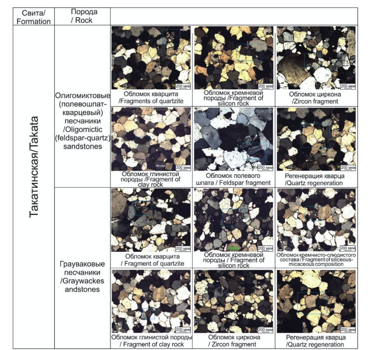 Покрывающие конгломераты и гравелиты песчаники являются кварцевыми светло-серыми мелко-среднезернистыми, равномерно- и неравномернозернистыми. Цемент песчаников регенерационный кварцевый, реже поровый, железистый и гидрослюдистый. Кроме кварца в незначительных количествах присутствуют обломки аргиллитов, кремневых пород и кварцитов. Разнозернистые и гравийные песчаники нередко содержат плоскую гальку («окатыши») зеленоватых аргиллитов, предположительно, из нижележащих отложений. Отличительной чертой некоторых разновидностей песчаников западного типа разреза такатинской свиты является присутствие в них обломков щелочных эффузивов [24]. Из аллотигенных минералов в основном присутствуют исключительно устойчивые к выветриванию. Характеристика минералов тяжелой фракции в основных типах пород такатинских слоев (песчаников, гравелитов и конгломератов) показывает в аутигенной части преобладание лимонита (8,0–37,3 %), а в аллотигенной – циркона (30,1–62,0 %), турмалина (4,0–13,4 %), лейкоксена (4,6–18,2 %), рутила (1,2–6,0 %). Очень редки моноклинные и ромбические пироксены, гранат-альмандин и пироп, монацит [25].