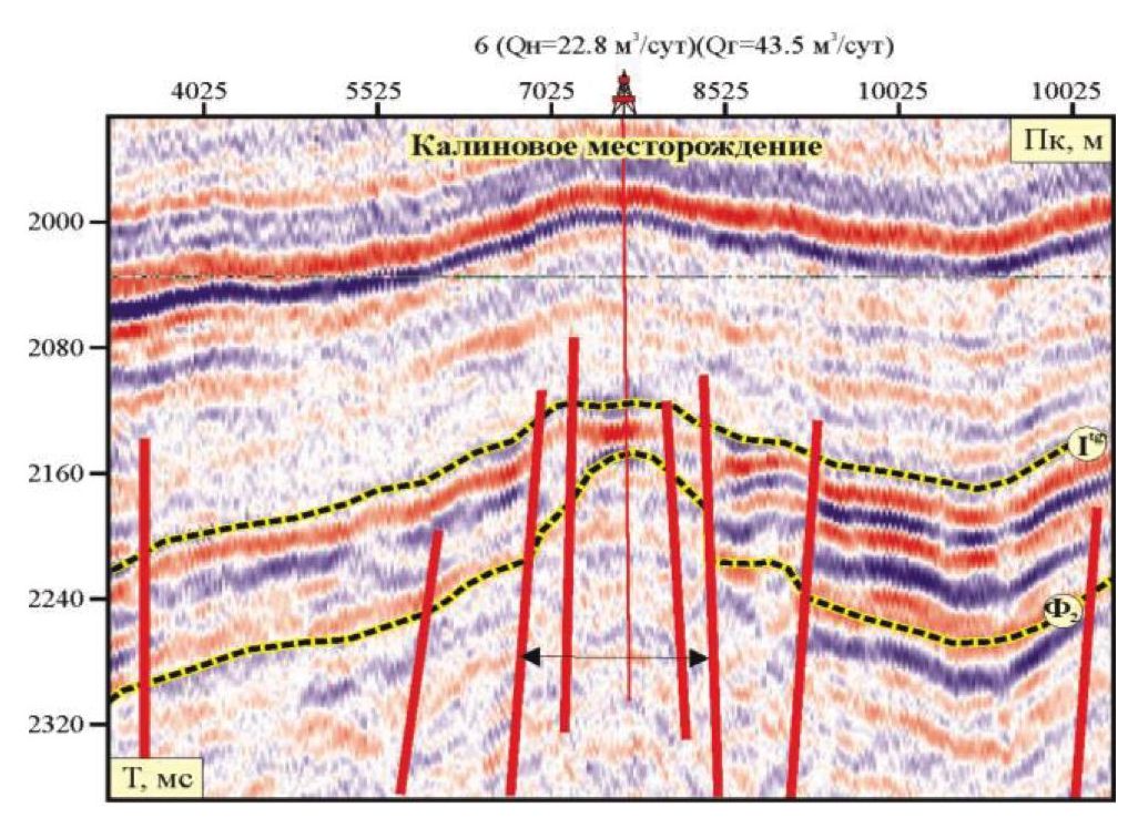 Fig. 3. Erosional-tectonic uplifts of the pre-Jurassic deposits at the Kalinovoe field, composed of carbonate-siliceous rocks [3]