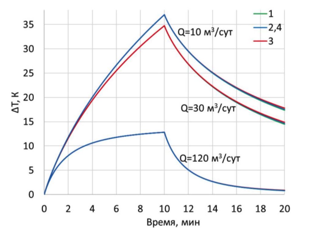 Основной задачей моделирования является исследование влияния потока жидкости в пространстве за обсадной колонной на особенности теплового поля в ней. На первом этапе рассматривается индукционный нагрев обсадной колонны на участке скважины, пересекающей пресноводный горизонт, и исследуется чувствительность температуры колонны к горизонтальному плоскопараллельному движению воды в пресноводном горизонте при герметичном цементном кольце (сценарий 1). На рис. 3 показана динамика изменения во времени температуры внутренней поверхности колонны (здесь и далее приведена разность между текущей и начальной температурой колонны ΔT=T–Tinlet в точках 1–4 (рис. 1), характеризующая ее разогрев) при различном расходе жидкости в стволе скважины. Скорость жидкости в пресноводном горизонте принята 10–4 м/c. Ввиду симметрии модели температура в точках 2 и 4 совпадает.