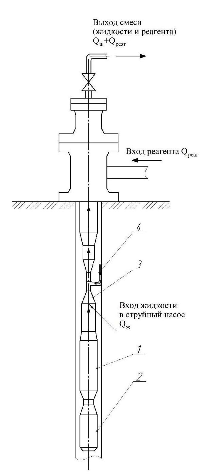 Рис. 1. Скважинная насосная установка для дозирования реагента – ингибитора АСПО: 1 – центробежный насос; 2 – погружной электродвигатель; 3 – струйный насос; 4 – патрубок насоса, дозирующего реагент