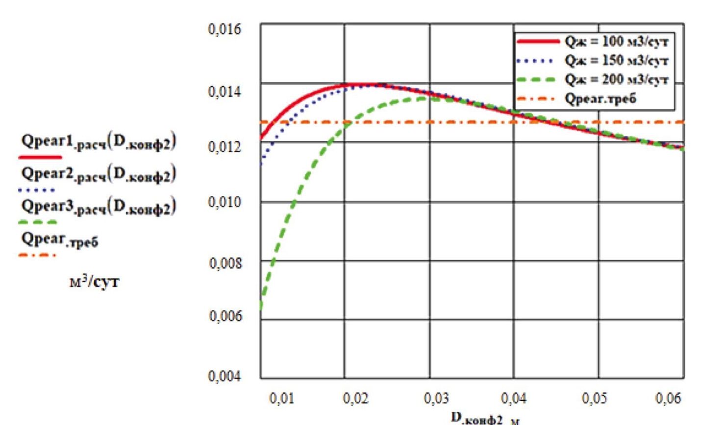 Зависимость расхода реагента от диаметра проходного отверстия насоса , дозирующего реагент, имеет параболический вид с ветвью, направленной наверх: при увеличении расход реагента возрастает вследствие снижения местных гидравлических сопротивлений в отверстии, дозирующем реагент. Подача насоса оказывает небольшое влияние на расход реагента: при увеличении подачи от 100 до 200 м3/сут максимальный расход реагента возрастает с 0,014 до 0,016 м3/сут (на 7 %). При этом для достижения требуемого расхода =0,0123 м3/сут при увеличении дебита скважины со 100 до 200 м3/сут диаметр проходного отверстия насоса, дозирующего реагент, должен увеличиться с 0,01 до 0,0128 м (на 28 %).