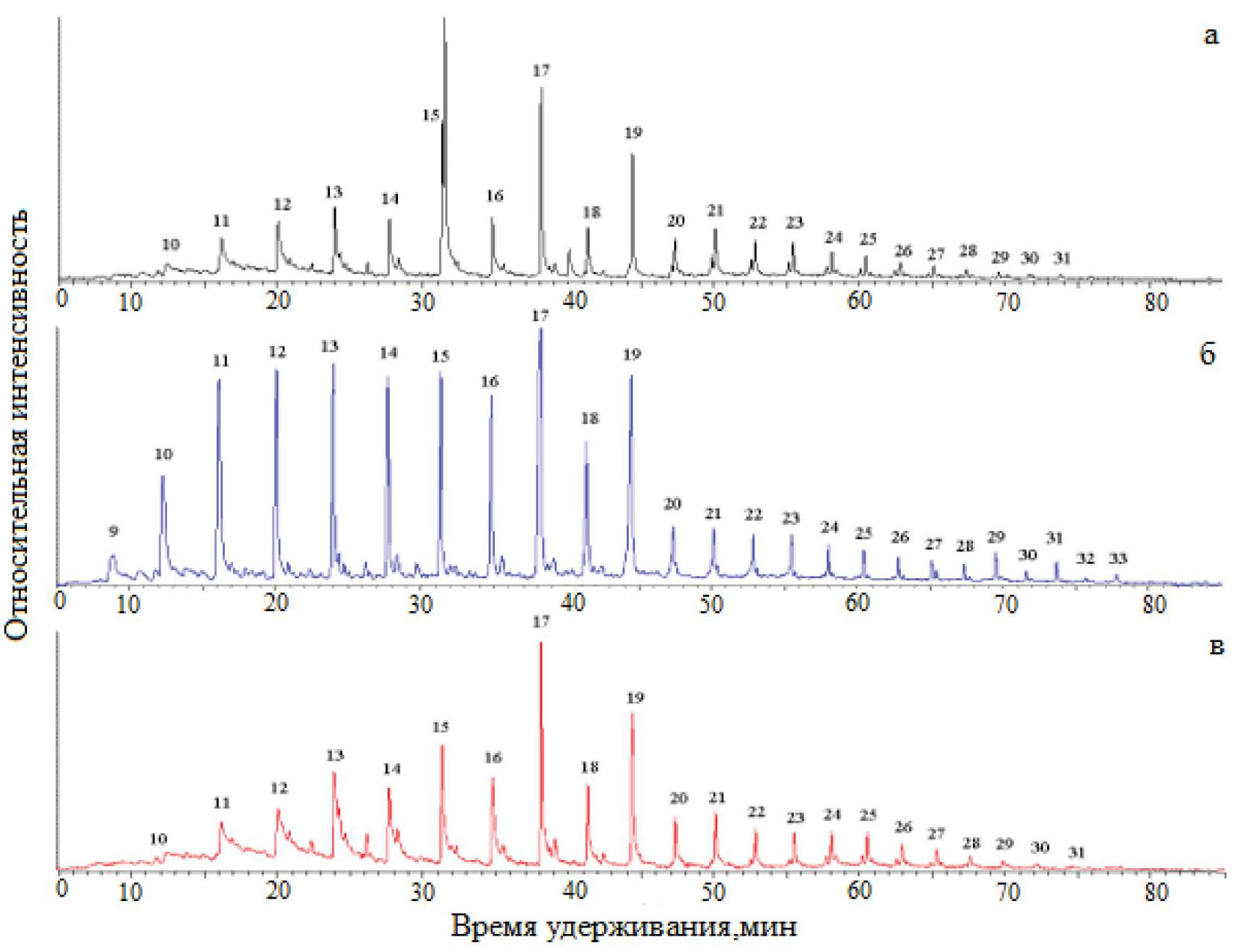 Fig.1. GC-MS chromatograms for selective ions at m/z 74+88+98+191 of RICO products of high molecular asphaltenes of bituminous oils I (a), II (б) and III (в); methyl esters of monocarboxylic acids are numbered from 9 to 33 (the figures indicate the number of carbon atoms)