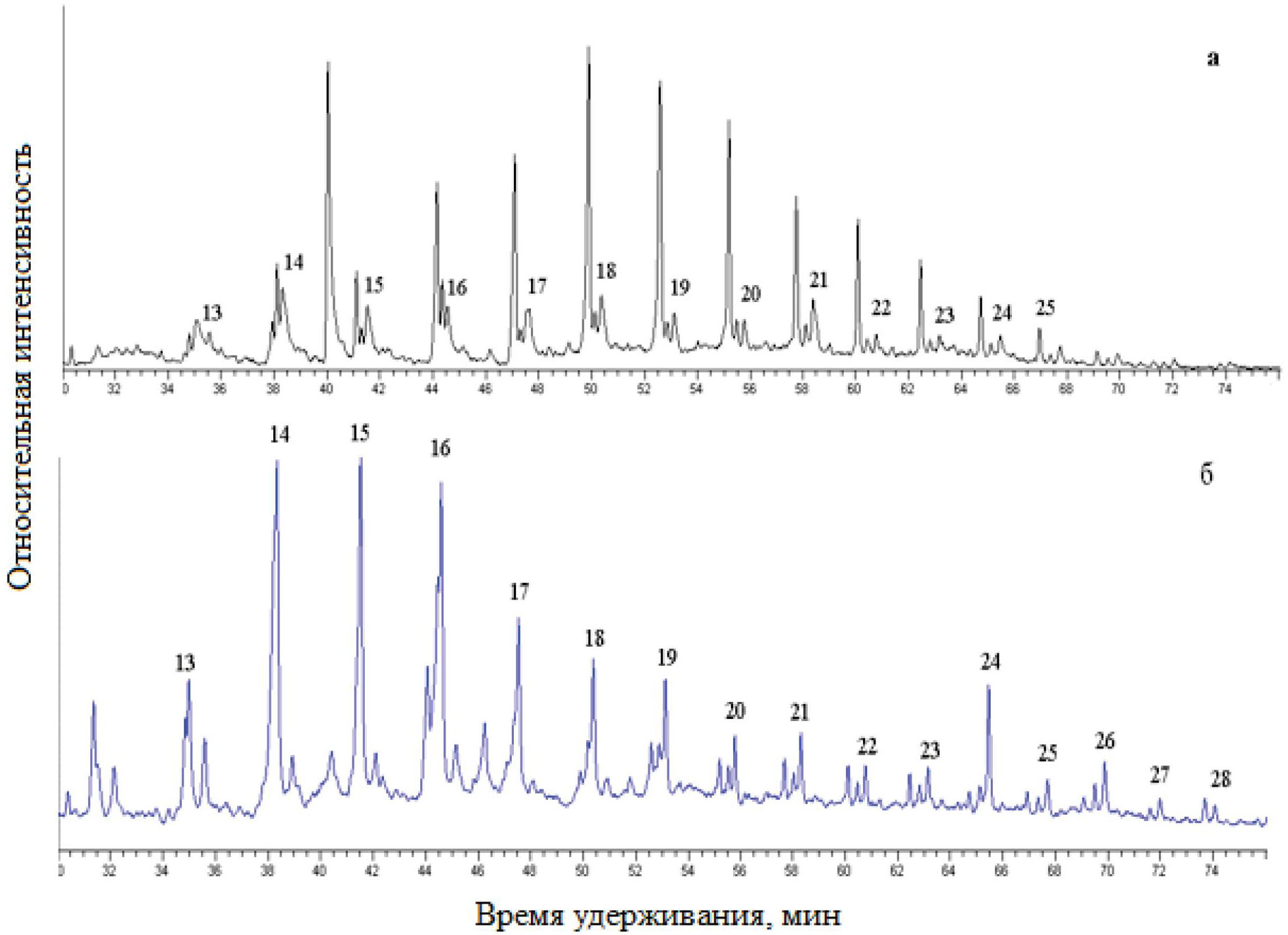 Рис. 3. Масс-хроматограммы по m/z 98 продуктов RICO высокомолекулярных асфальтенов битуминозных нефтей I (а) и II (б)