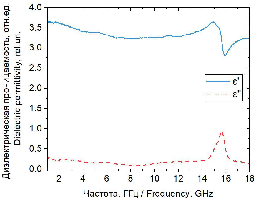 Для измерений использован векторный сетевой анализатор Р4М-18 (Микран, Россия), который предварительно калибровали. Затем тороидальный образец помещали между внутренним и внешним проводниками воздушной линии, и осуществляли измерения характеристик «передачи» и «отражения». Измерения проводили в диапазоне частот от 40 МГц до 18 ГГц. Исходя из полученных характеристик, путем пересчета определяли величины мнимой (ε'') и действительной (ε') составляющих комплексной диэлектрической проницаемости в зависимости от частоты излучения. Из этих параметров рассчитывали величину тангенса диэлектрических потерь, характеризующего величину мощности, поглощаемой образцом. Расчет осуществляли по формуле: