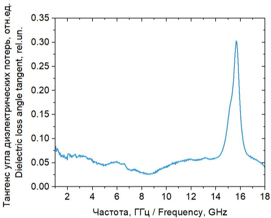 Из рис. 3 видно, что значение тангенса угла диэлектрических потерь, а следовательно, и обеспечивающей нагрев рассеиваемой мощности, не постоянно и зависит от частоты. Для обеспечения максимально возможного уровня поглощаемой образцом мощности необходимо использовать частоту, на которой величина диэлектрических потерь имеет максимальную величину. Наибольшие значения наблюдаются на частотах 2–4 и 14–17 ГГц. Пик в диапазоне частот 14–17 ГГц, вероятнее всего, объясняется наличием объемного резонанса, связанного с размерами исследуемого образца [22]. Полученные результаты указывают на возможность эффективного использования наиболее распространенных и доступных магнетронов с частотой излучения 2,45 ГГц.