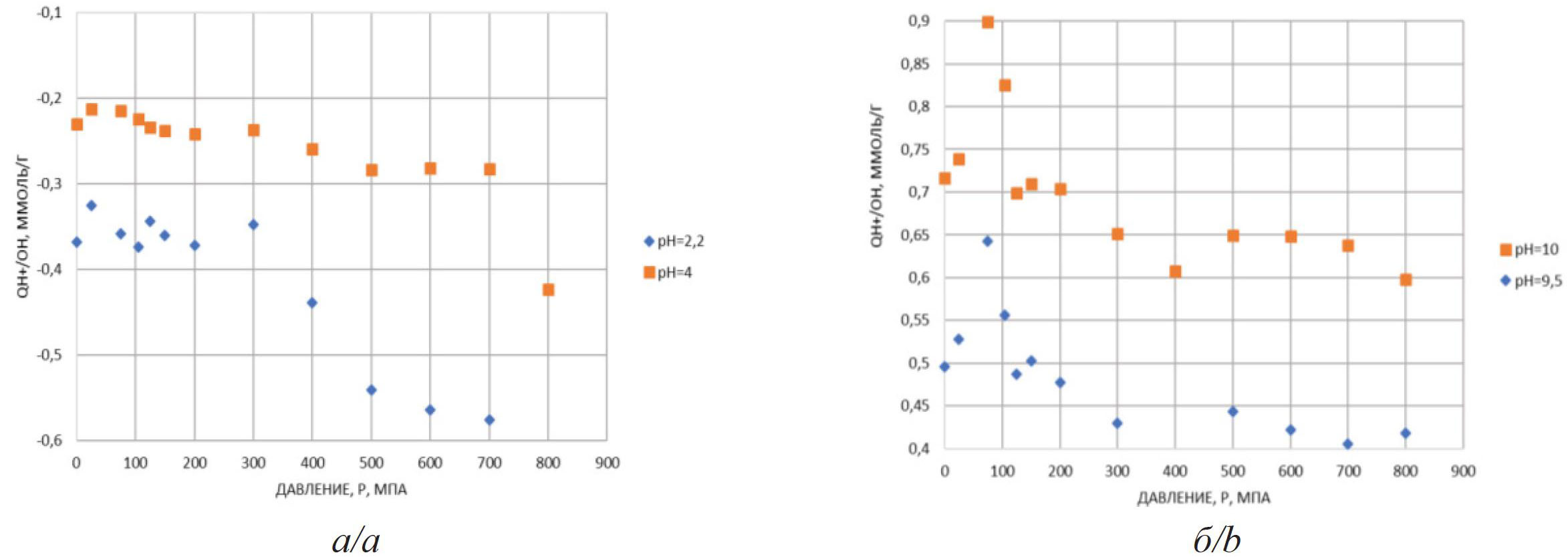 Рис. 5. Зависимость анионообменной емкости QH+/OH бентонитовой глины от давления при рН=2,2 и рН=4 (а) и зависимость катионообменной емкости QH+/OH бентонитовой глины от давления при рН=10 и рН=9,5 (б)