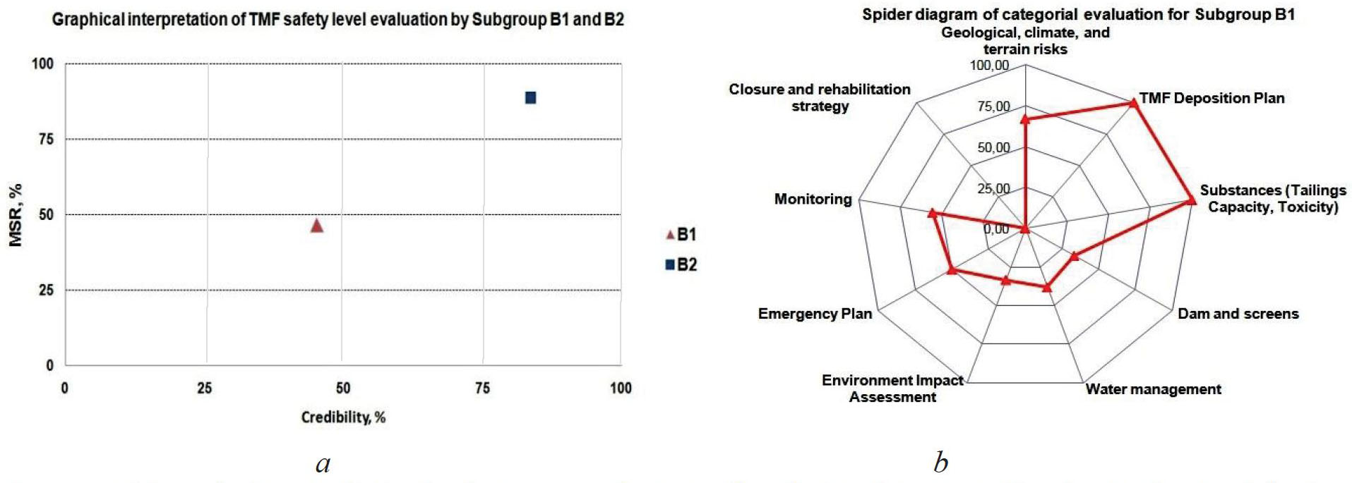 Evaluation of the results. The updated version of the TMF methodology (2019) for the TMF safety was applied to evaluate the safety level of the Nahatak TMF. The key novelties were (1) the equivalence of the evaluations obtained for visual and document checks, (2) introduction of the critical questions of doubled weight in comparison to general ones in both subgroups B1 and B2, and (3) more detailed categorial evaluation for visual check. The results of TMF safety evaluation are given in Table 2 and in Fig. 2, 3. The visual inspection provided answers to 35 questions of Subgroup B1 “Detailed visual inspection” with relevant justification/comments in column “S” of the Excel file, as well as to 259 questions of Subgroup B2 "Detailed Document Check". The evaluation matrix was filled in at the TMF site during a week after the field reconnaissance. The measures were proposed after checking the answers/evaluation matrix and having insight into the drone footage.