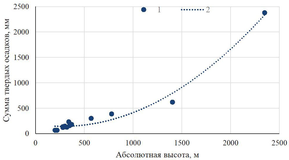 По результатам выполненных расчетов и данных наблюдений на метеостанциях построена зависимость суммы твердых осадков от высоты для бассейна р. Тубы (рис. 2).