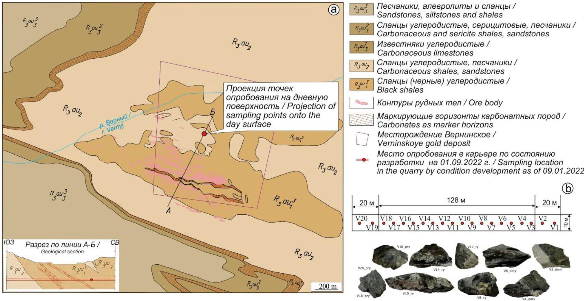 Рис. 2. a) геологическая карта и разрез Вернинского золоторудного месторождения; b) схема расположения точек отбора образцов по рудному блоку и их фотографии