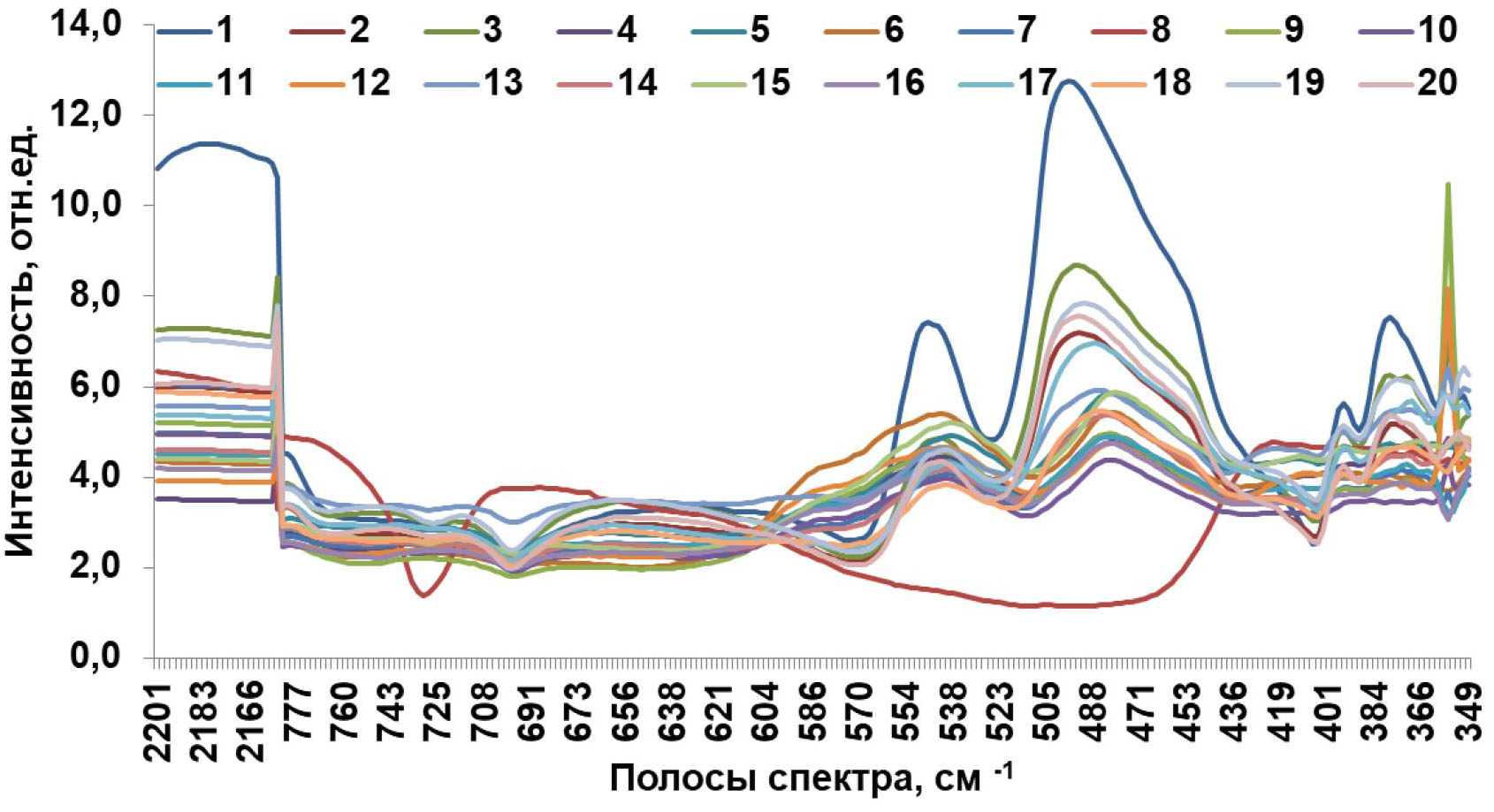 Рис. 3. Спектральная характеристика образцов №№ 1–20 в интервалах 2201–2166, 777–350 см–1