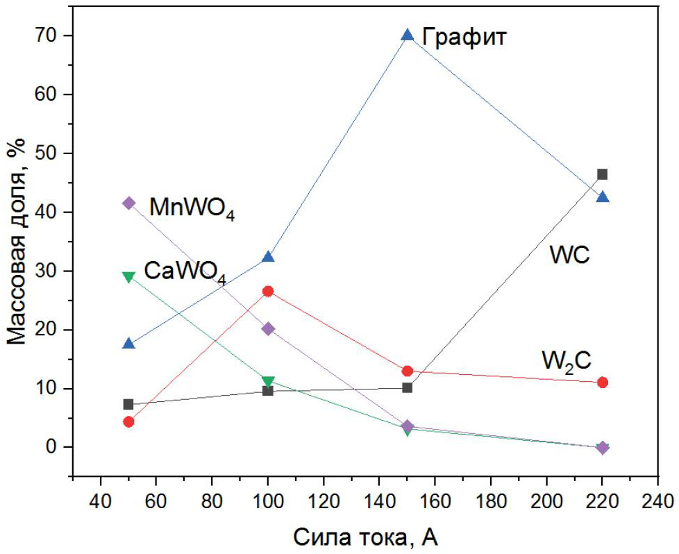 Корректность интерпретации полученных данных подтверждается результатами рентгенофазового анализа, осуществленного методом корундовых чисел (рис. 2). Наглядно видно снижение массового содержания оксидных фаз с ростом энергетики процесса и, в частности, силы тока, а также увеличение выхода карбидных фаз, начиная со значения 150 А. При оптимальных параметрах выход гексагональной фазы карбида вольфрама WC составляет практически 50 мас. %, а оставшуюся долю занимает углерод, который образуется в результате электроэрозии графитовых электродов.
