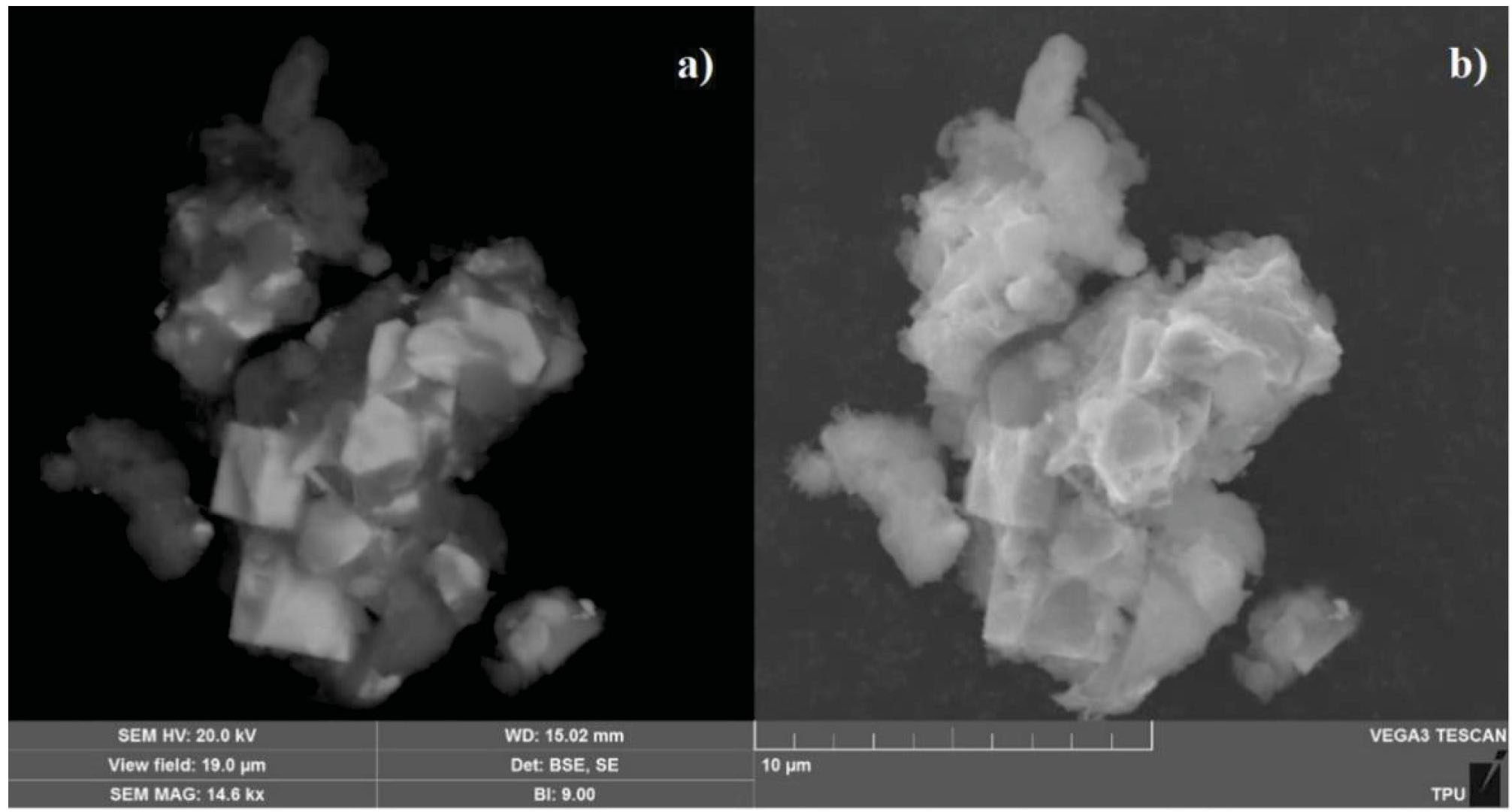 Рис. 4. Снимки сканирующей электронной микроскопии продукта синтеза в режиме: a) BSE; b) SE