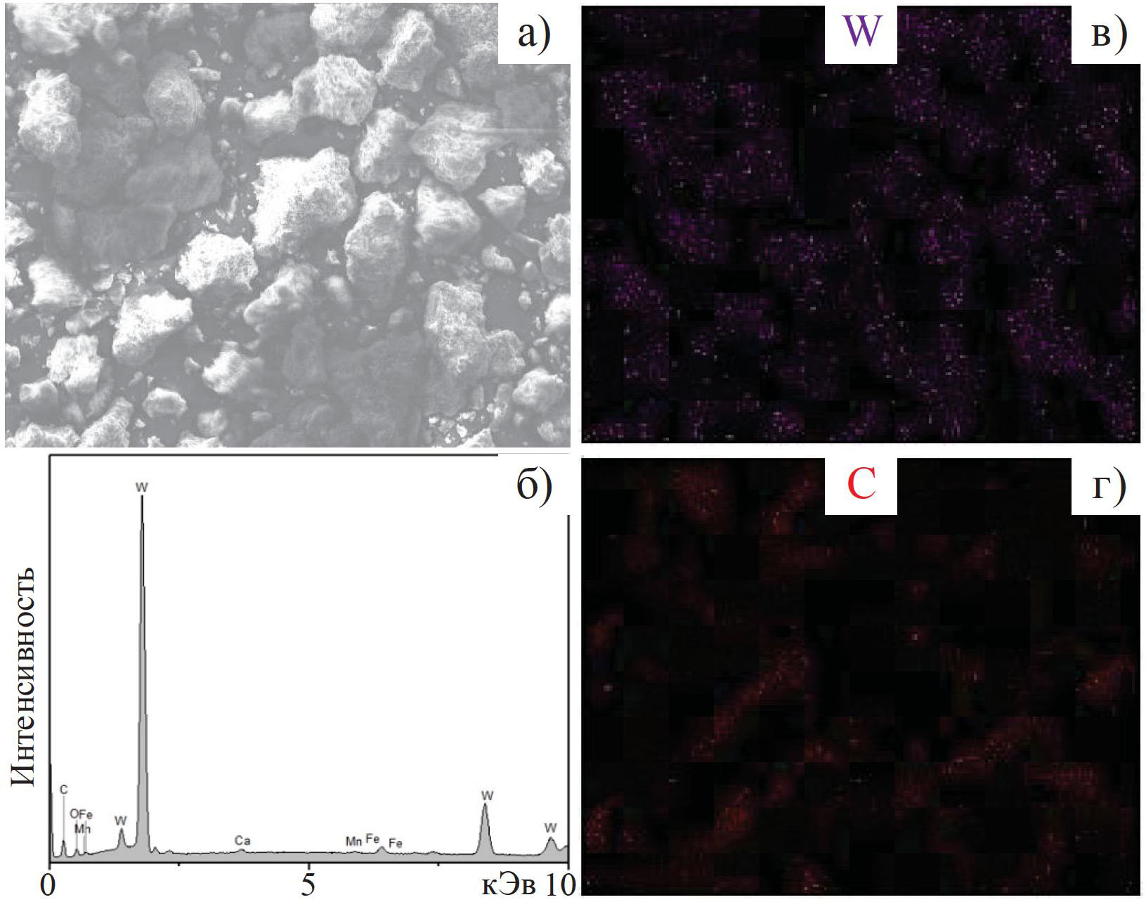Fig. 5. Results of the energy dispersive analysis of the synthesis product obtained under optimal conditions at a current of 220 A: a) overview micrograph of the study area; б) energy dispersive spectrum; в, г) mapping by W and C elements