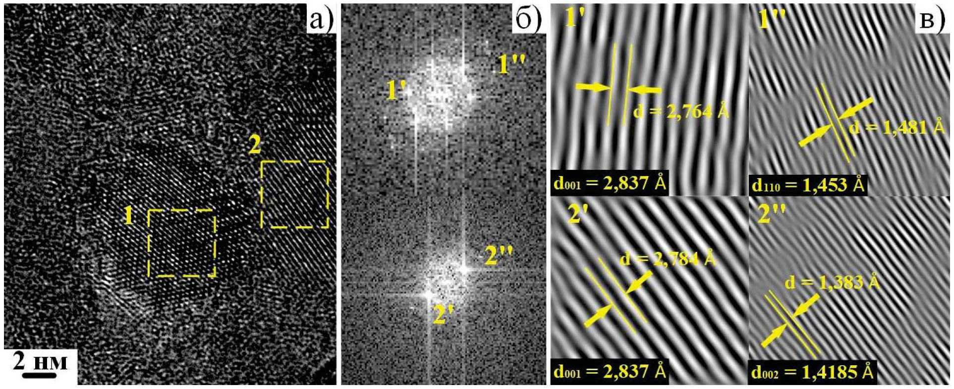 Рис. 6. Результаты просвечивающей электронной микроскопии высокого разрешения продукта синтеза, полученного в оптимальных условиях при силе тока 220 А: а) снимок высокого разрешения; б) SAED-изображения; в) изображения направления плоскостей с выделенных рефлексов