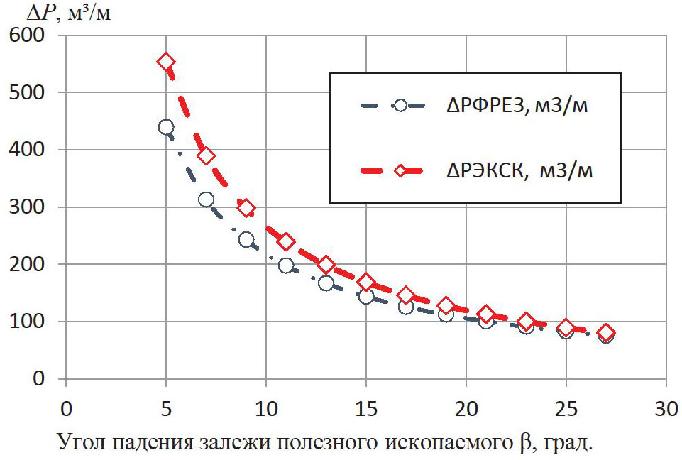 График зависимости объёмов разубоживания руды на контакте руда–порода от угла падения пласта руды (рудного тела) для горнотехнических условий отработки месторождения с использованием экскаватора и карьерного комбайна Surface Miner представлен на рис. 3.
