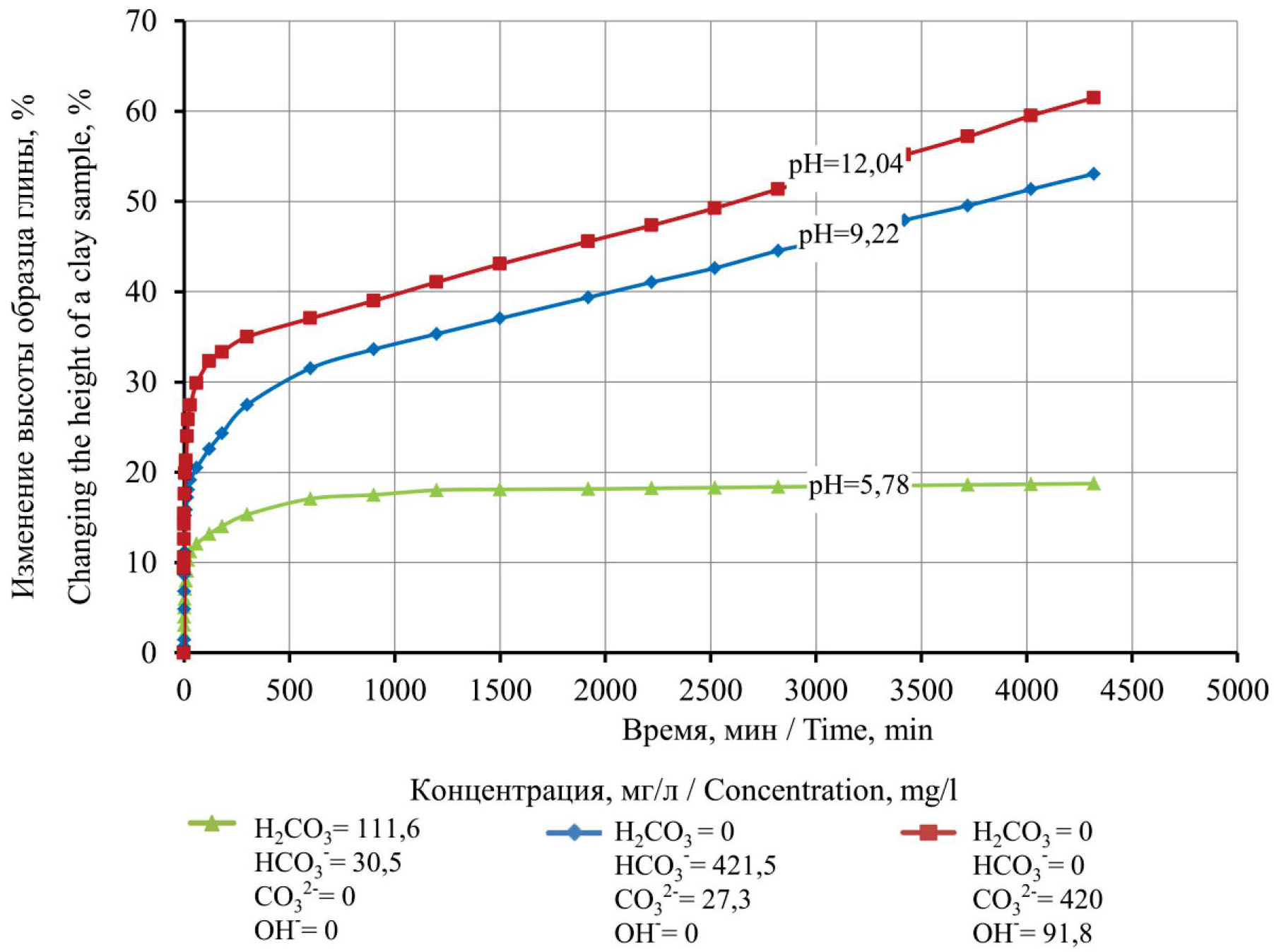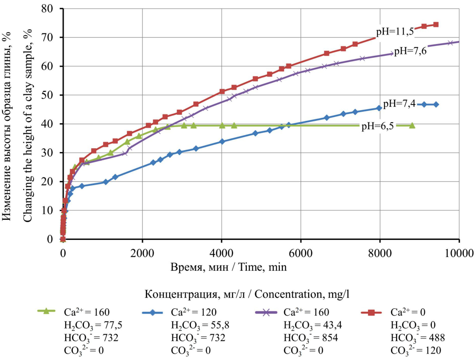 Из графических зависимостей, иллюстрирующих динамику набухания глинистого образца в водах, содержащих ионы Ca2+, эквивалентная концентрация которых меньше концентрации угольной кислоты, бикарбонатов и карбонатов, видно, что в присутствии двухвалентных катионов возможно прогрессирующее набухание глины.