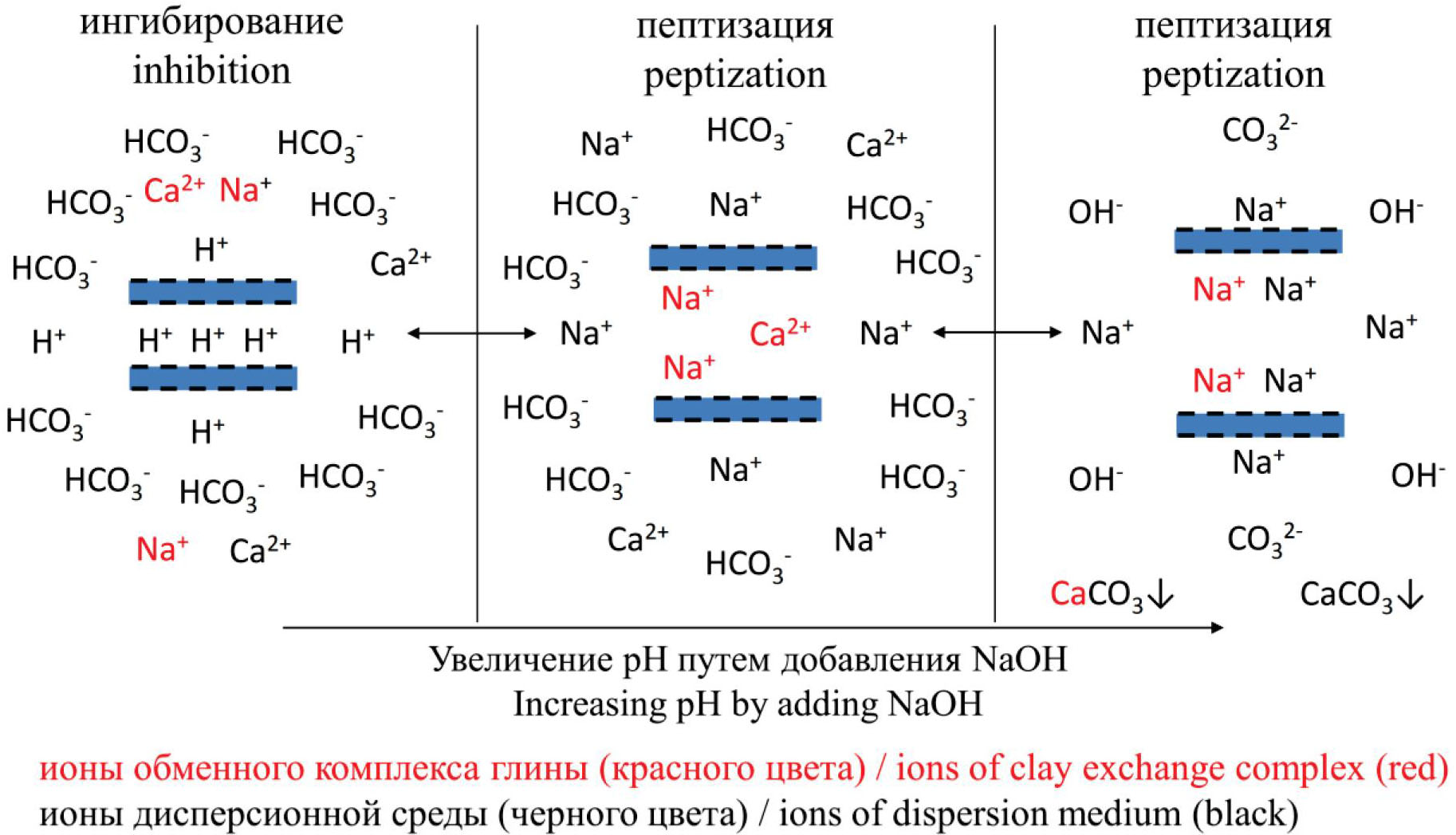 - бикарбонат-ионы HCO3– способствуют пептизации глины – оттягивая с ее поверхности обменные катионы, в том числе ионы Ca2+, они увеличивают толщину ДЭС;