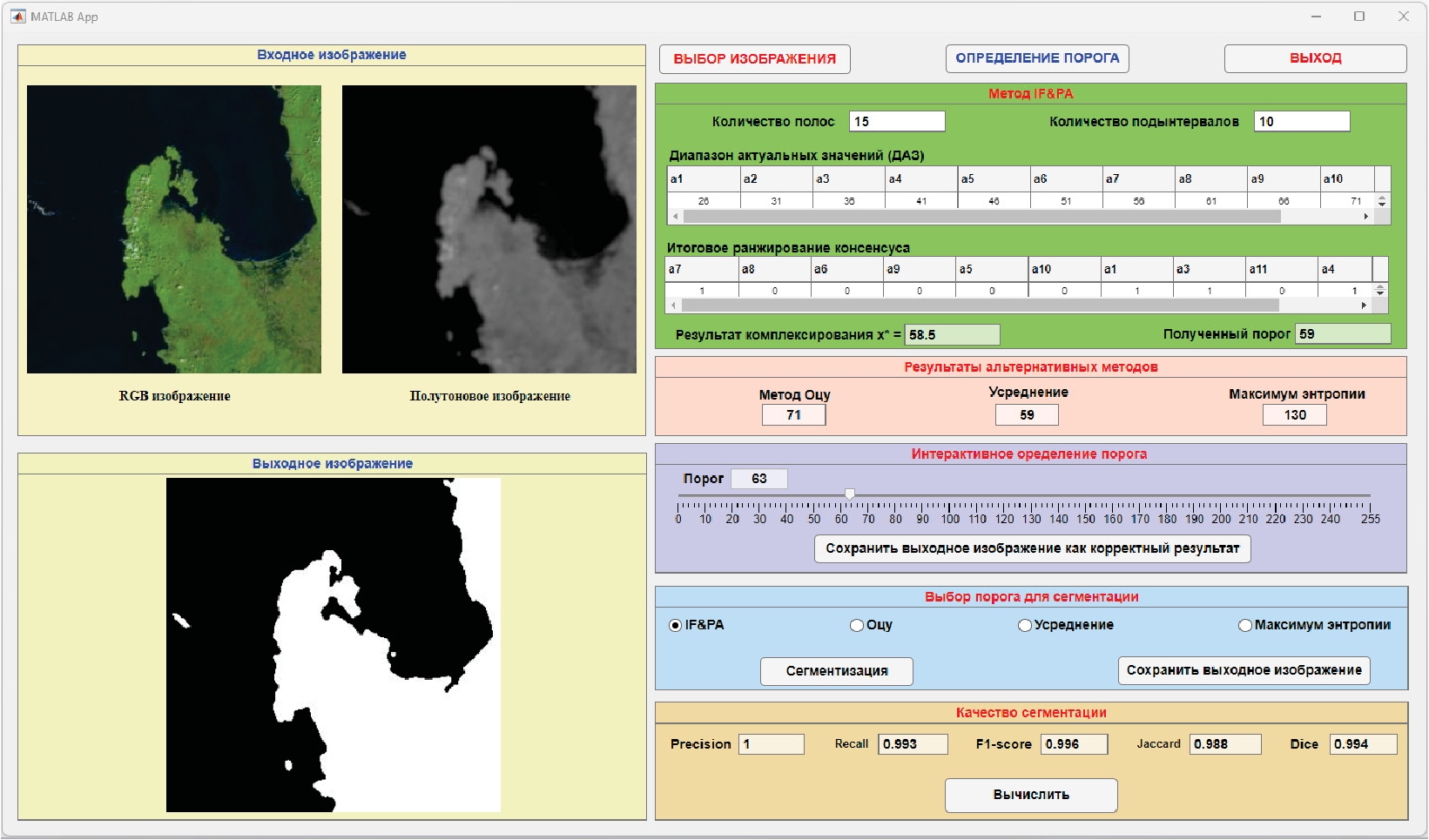 Для экспериментальной проверки предложенного метода было разработано программное обеспечение (ПО) в среде технических вычислений Matlab. На рис. 3 показан вид пользовательского интерфейса разработанного ПО. Пользователь имеет возможность выбрать исходное анализируемое изображение, задать параметры метода IF&PA, обработать изображение другими пороговыми методами, в том числе ручным (интерактивным) методом, результат которого считается правильным. Результат сегментации выводится на экран монитора c соответствующими оценками типовых мер качества распознавания.