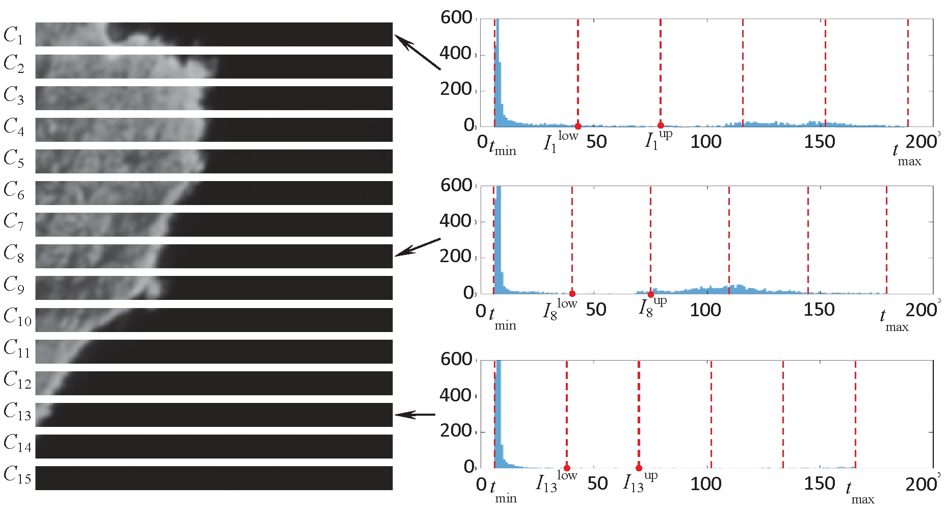 Для того чтобы выявить пороговое значение яркости (1), отвечающее наиболее близкому к истинному различию между сегментируемыми областями, исходное изображение необходимо разделить на несколько частей, каждая из которых будет характеризоваться своим распределением интенсивности пикселей. Для этого будем разбивать анализируемое полутоновое изображение C на 15 горизонтальных полос равной высоты [23]. По гистограммам полос будем определять соответствующие интервалы {Ik} яркости образующих их пикселей. По этим интервалам с помощью процедуры IF&PA будем вычислять робастное значение порога яркости, которое будем использовать для сегментации (формирования выходного изображения D).