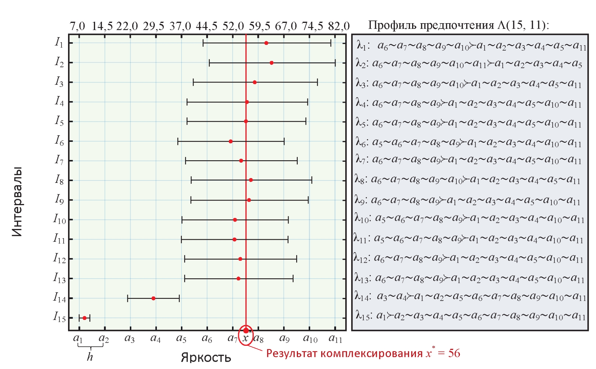 Набор интервалов Ik, k=1, 2, …, 15, подается на вход процедуры IF&PA, которая формирует диапазон актуальных значений A={a1, a2, …, a11}, как показано на рис. 6. Нижняя граница ДАЗ a1=7, верхняя граница a11=82, норма h=(827)/10=7,5. Полученные 11 дискретных значений интенсивности a1, a2, …, a11 показаны на левой вертикальной оси на рис. 6. Соответствующие интервалам ранжирования, сформированные в соответствии с выражениями (2)(5), образуют входной профиль предпочтения Λ(15, 11), показанный в правой части рис. 6.