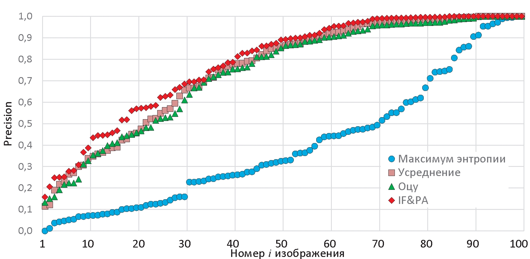 Fig. 9. Graphs of ordered values of the Precision metric for images i=1, …, 100, processed by methods of maximum entropy (blue), averaging (yellow), Otsu (green) and IF&PA (red)